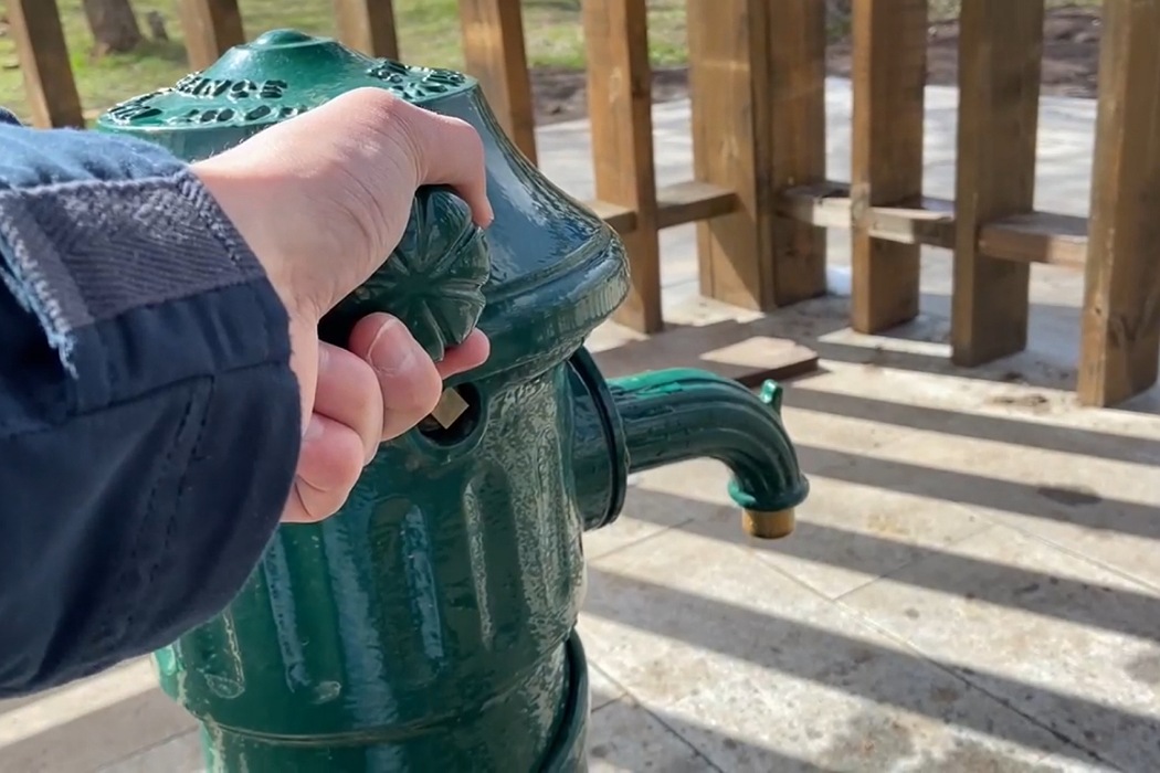 По просьбам жителей района провели реконструкцию и восстановили подачу воды в колодце. Теперь она представляет собой стилизованную под ретро колонку внутри решетчатой беседки.