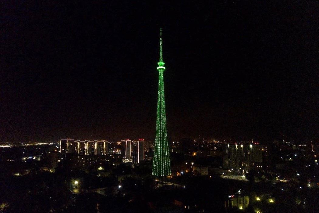Челябинская телебашня превратится в новогодние дни в огромную елку. Праздничная подсветка проработает на ней до конца праздничных выходных.