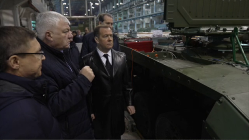 Медведев отметил, что обсудил с руководством завода текущие проблемы. Также зампредседателя Совета безопасности говорил об ускорении поставок техники для спецоперации.