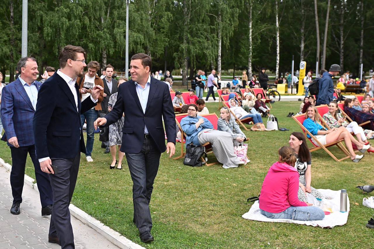 Евгений Куйвашев осмотрел парк Маяковского, пообщался с жителями и представил зрителям фильм «Любовь и голуби» Фото: