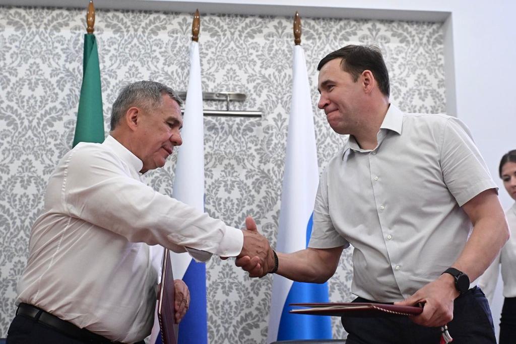 Губернатор Свердловской области Евгений Куйвашев и президент Республики Татарстан Рустам Минниханов 3 июля подписали план мероприятий по реализации соглашения о сотрудничестве между регионами.