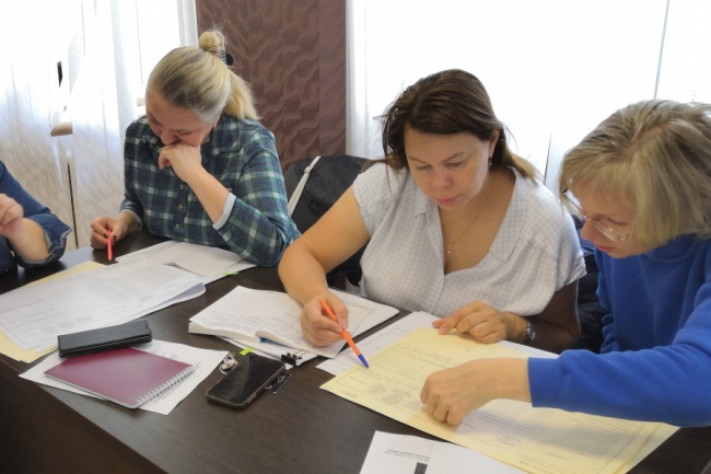На занятии члены участковых комиссий практиковались в работе со списком избирателей: получив 2 «тренировочных списка» они должны были выполнить постраничный подсчет числа избирателей, включенных в список, правильно посчитать и заполнить «подвал» каждой страницы списка и внести итоговые данные на последний лист списка.