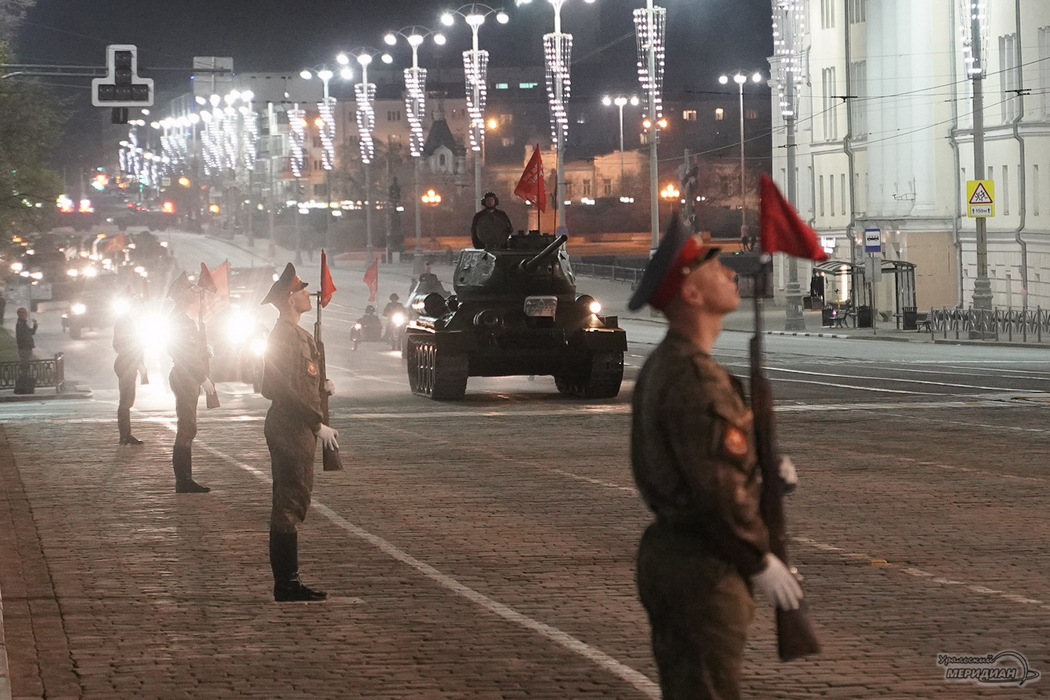 В ночь с 3 на 4 мая в центре Екатеринбурга прошла совместная тренировка парадных расчетов и военной техники. Во время репетиции торжественным маршем прошли около 20 парадных подразделений и проехало более 100 единиц современной и исторической военной техники, сообщает корреспондент ИА «Уральский меридиан» с места события.