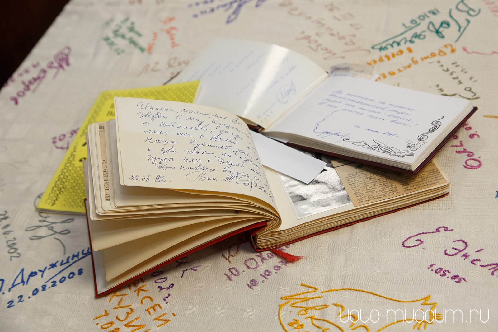 Инесса Иосифовна показала гостям скатерть, на которой более 30 лет собирает автографы известных уральцев. Ни белом полотне нитками мулине запечатлены росписи около 70 известных уральцев: от врачей до актеров.