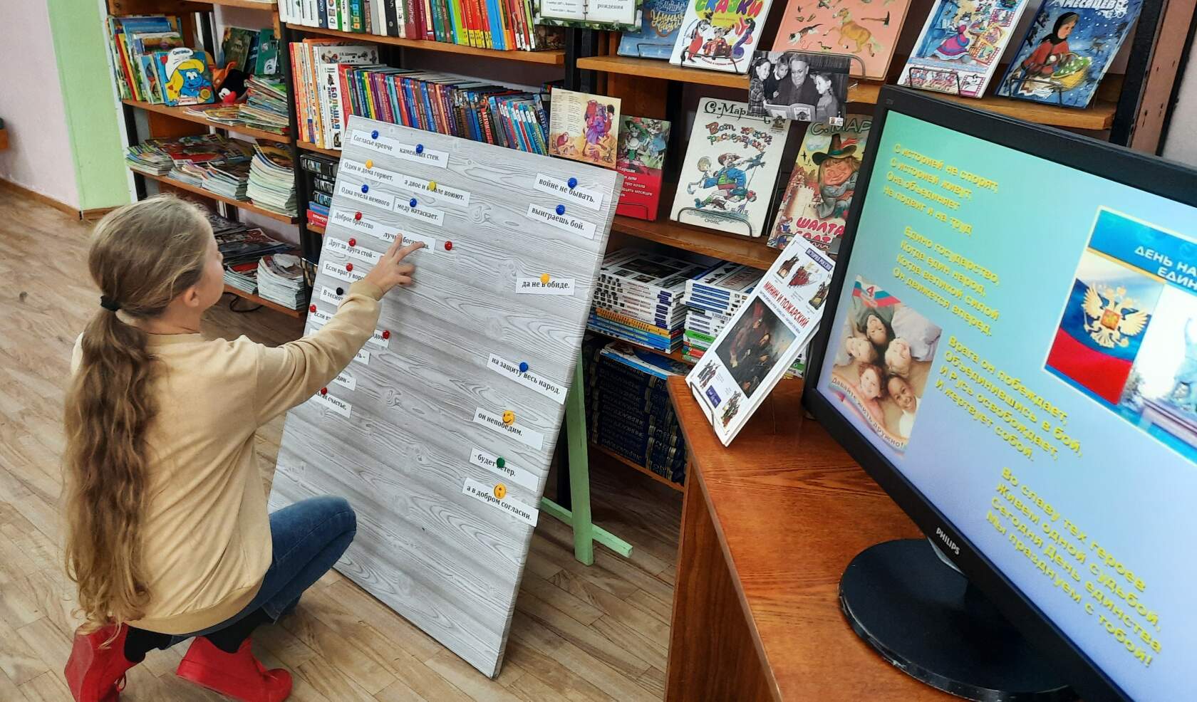 3 ноября в городской библиотеке семейного чтения – филиале № 8 была проведена конкурсно-познавательная программа «Россия. Родина. Единство» . Обучающиеся младших классов СОШ № 2 познакомились с историей возникновения этого праздника. Библиотекарь Евгения Бахмат в роли Красной девицы задавала вопросы, касающиеся русской мифологии и праздников, традиций и обычаев народов, населяющих Россию.