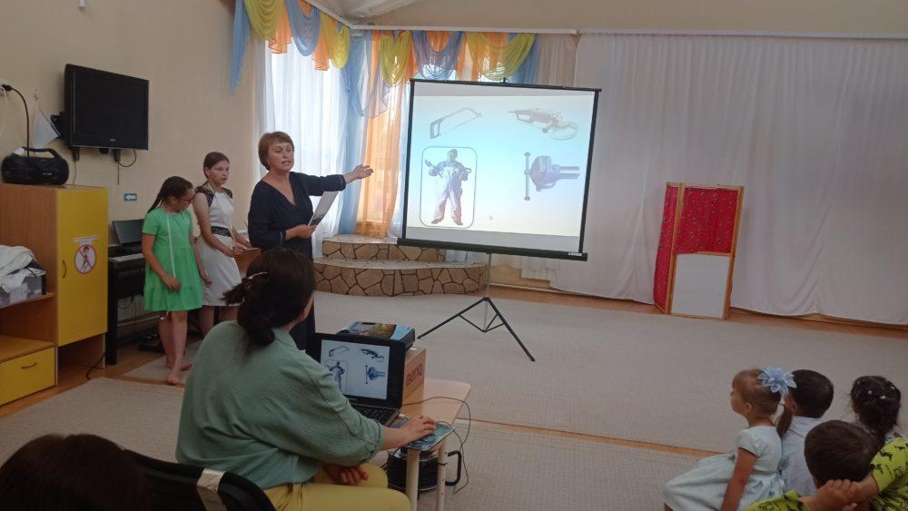 В первую очередь мы рассказали ребятам о своей профессии библиотекаря. Затем рассказали детям о произведениях художественной литературы и поэзии, посвященных различным профессиям, об авторах, которые написали книги. Далее мы вспомнили пословицы и поговорки о труде, сыграли в игру «Самая, самая», где оказалось, что самой волосатой профессией дети назвали профессию Парикмахера, и это верно! Отгадывали загадки, читали стихи, а так же во время демонстрации презентации отвечали на вопрос: Что делает? каждый из представленных на экране специалистов.