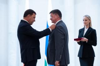 Губернатор региона Евгений Куйвашев за особые заслуги в сфере социально-экономического развития Свердловской области наградил главу Березовского Евгения Писцова знаком отличия «За заслуги перед Свердловской областью» III
