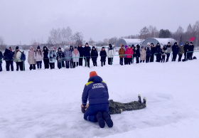 На учебном манекене специалисты продемонстрировали школьникам приёмы оказания помощи провалившимся под лёд.