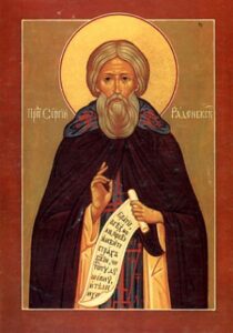 Иже добродетелей подвижник,/ яко истинный воин Христа Бога,/ на страсти вельми подвизался еси в жизни временней,/ в пениих, бдениих же и пощениих образ быв твоим учеником,/ темже и вселися в тя Пресвятый Дух,/ Егоже действием светло украшен еси;/ но, яко имея дерзновение ко Святей Троице,/ поминай стадо, еже собрал еси, мудрe,/ и не забуди, якоже обещался еси,/ посещая чад твоих,// Сергие, преподобне отче наш.