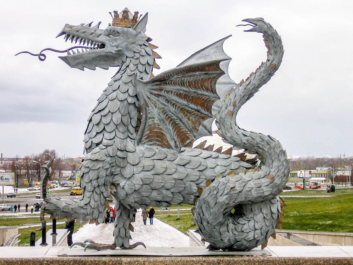 Памятник Коту Казанскому. Когда Екатерина разъезжала по улицам Казани, её удивила их чистота и отсутствие крыс. Царице объяснили, что в Казани вывели новый вид котов, которые с лёгкостью уничтожают мышей. Выслушав этот рассказ, царица приказала собрать 30 таких котов и, уезжая, забрала их с собой. И надо сказать, что серые хищники со своей задачей отлично справились: очистили дворец от мышей. Увидев такие сногсшибательные результаты, царица зачислила их в свою лейб-гвардию с полноценным довольствием.