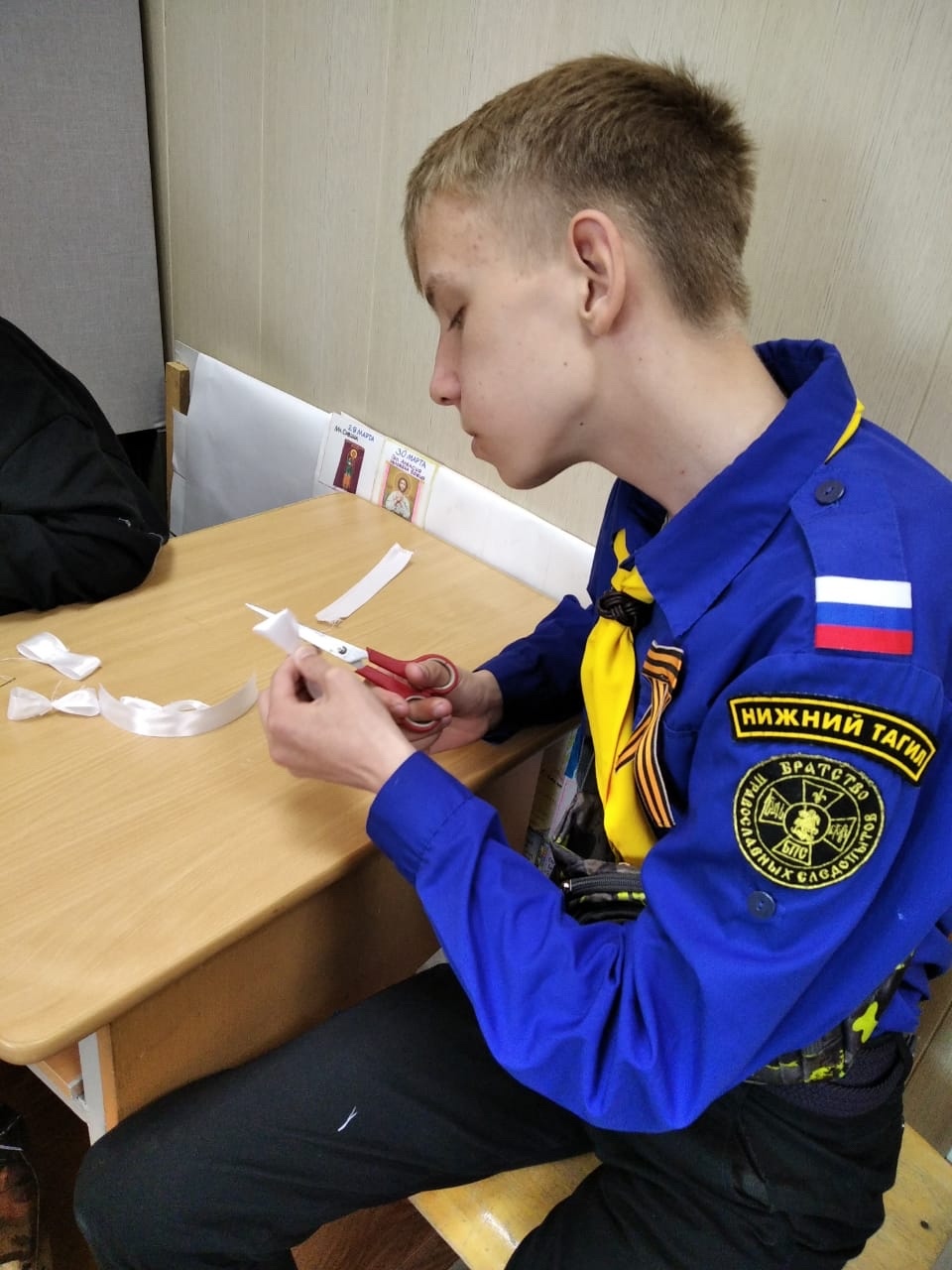 Педагог Коробейникова Надежда Петровна рассказала ученикам об истории возникновения праздника, а затем провела мастер-классы для детей всех возрастов: от 6 до 14 лет. Используя различные материалы (бумага, атласные и капроновые ленты, фатин), ребята изготовили 45 брошей в виде белых цветов для финального праздника.