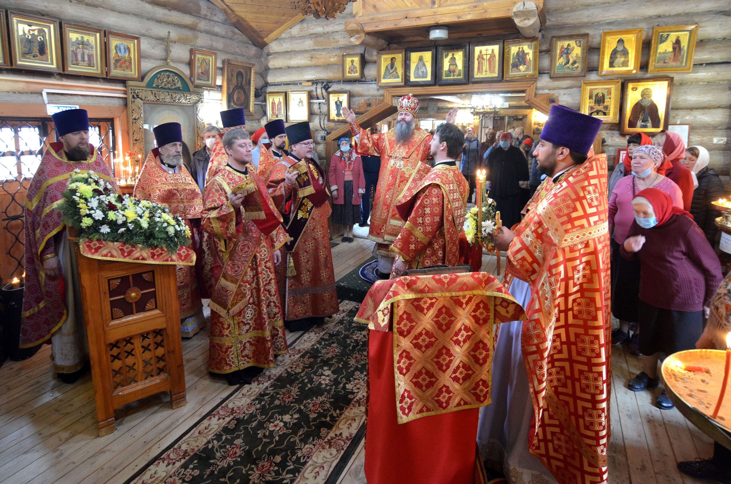 Здесь в храме во имя прп. Серафима Саровского владыка совершил Божественную литургию, в которой ему сослужили благочинный округа протоиерей Сергий Седин, Секретарь Епархиального совета иерей Григорий Елохин, настоятель Свято-Серафимовского храма протоиерей Алексей Ермаков, настоятель Воскресенской церкви иерей Михаил Кидяшов, настоятель Казанской церкви иерей Дмитрий Лисник, клирики прихода иереи Евгений Белоконь и Олег Королев.