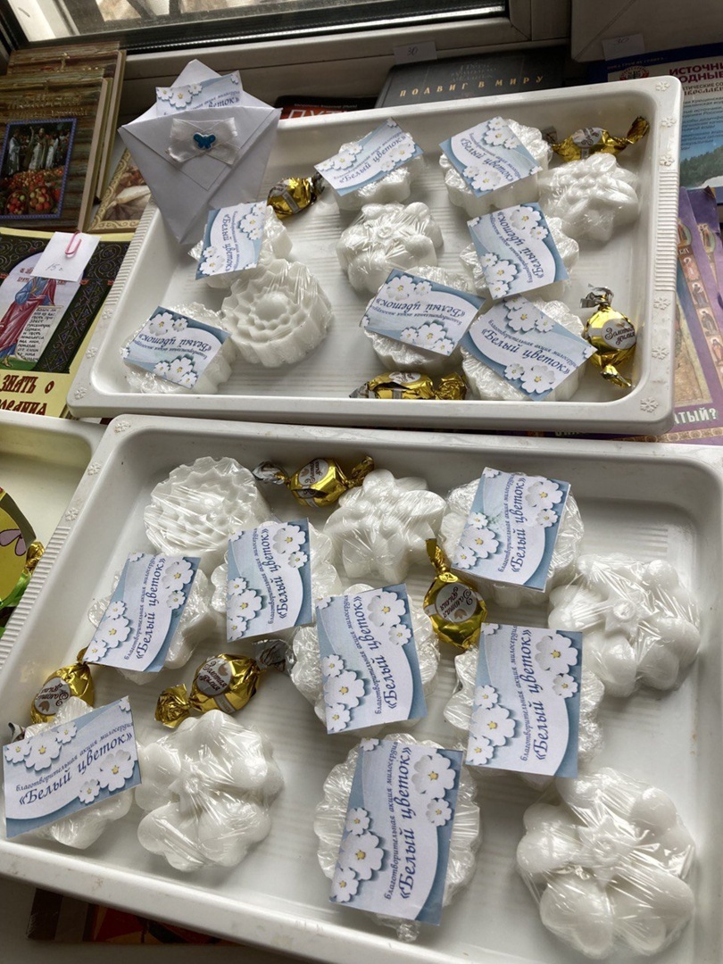 Красочно оформленные кусочки белого мыла с эмблемой акции за посильные пожертвования были предложены прихожанам. Вырученные средства будут направлены на дела милосердия по благословению настоятеля о. Михаила.