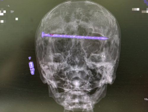 Мужчина поступил в приёмный покой Городской больницы №1 Нижнего Тагила в тяжёлом состоянии. На КТ медики увидели в костях черепа гвоздь, который прошёл через обе глазницы от правого до левого виска. Длина его достигала 15 сантиметров. Ситуация осложнялась повреждением твёрдой оболочки мозга и сдавлением глазных яблок.