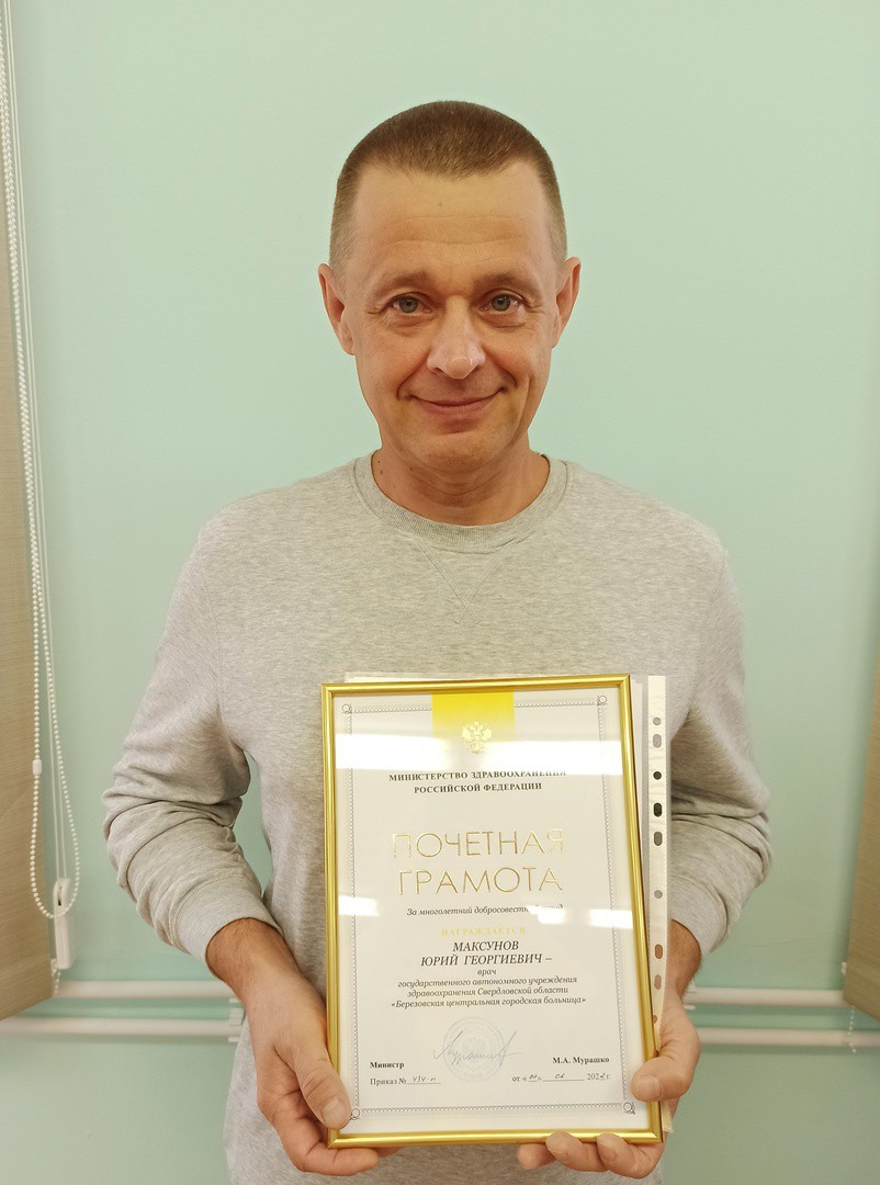 Высокую награду, а именно Почетную грамоту министерства здравоохранения Российской Федерации получил Юрий Георгиевич Максунов.