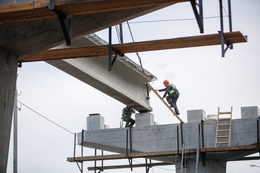 В мае 2022 года специалисты уложили первую балку пролета мостового сооружения. Конструкцию весом в 31 тонну и 21 метр длиной поднял мощный кран и под присмотром видеокамер дронов медленно, добиваясь высочайшей точности соединения конструкций, поместил на опоры.