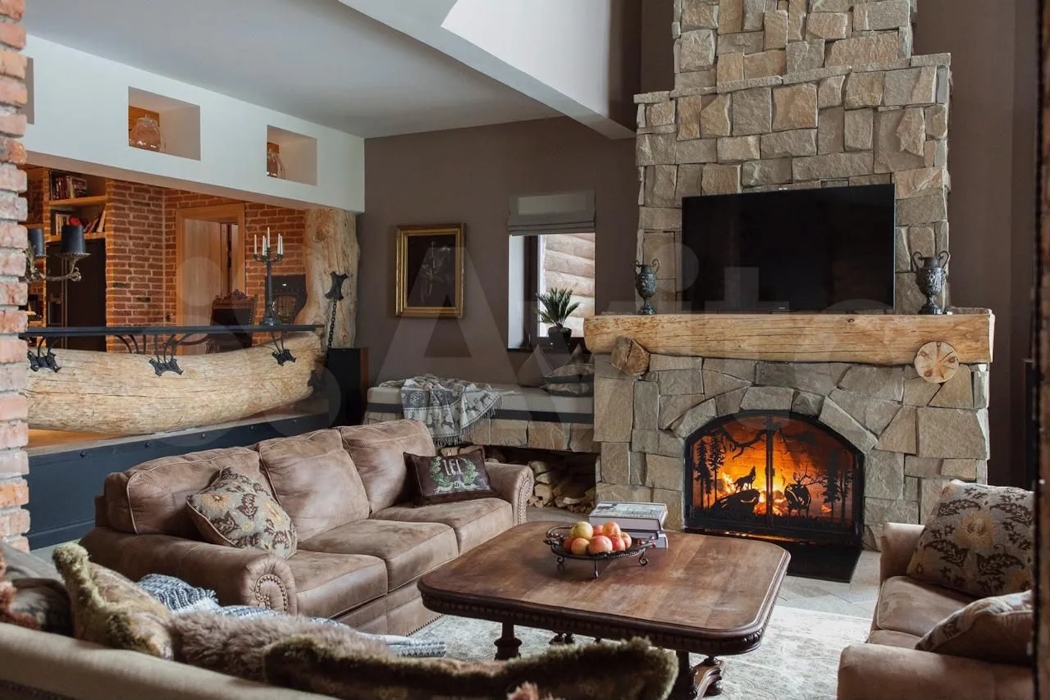 Так, основной дом общей площадью 500 кв.м., выполнен в стиле Шале, с использованием только натуральных материалов: дерево, камень, кирпич. Дом обставлен современной и антикварной эксклюзивной мебелью, гобеленами, картинами и зеркалами 19 века, привезенными из Франции.