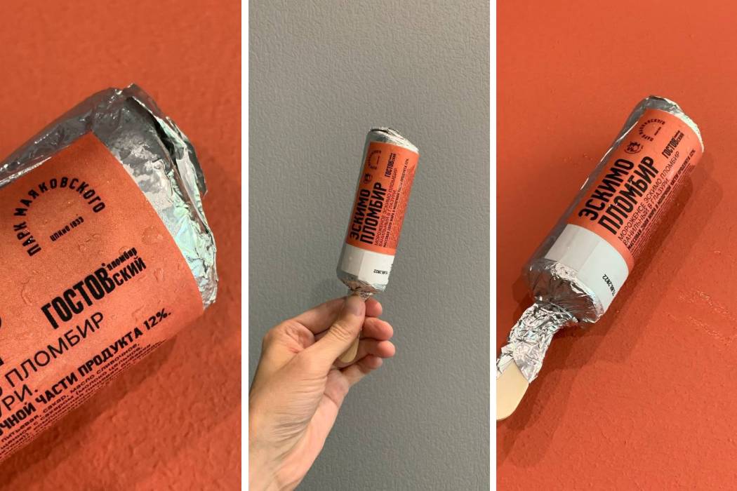 Дизайн упаковки эскимо выполнен в фирменном стиле. Внутри под шоколадной глазурью – пломбир. Ограниченная пробная партия продается на театральной площади парка, у центрального фонтана и на верхнем поле. Эскимо можно найти у продавцов с синими холодильниками. На разработку нового бренда и его упаковки ушло почти 2 года.