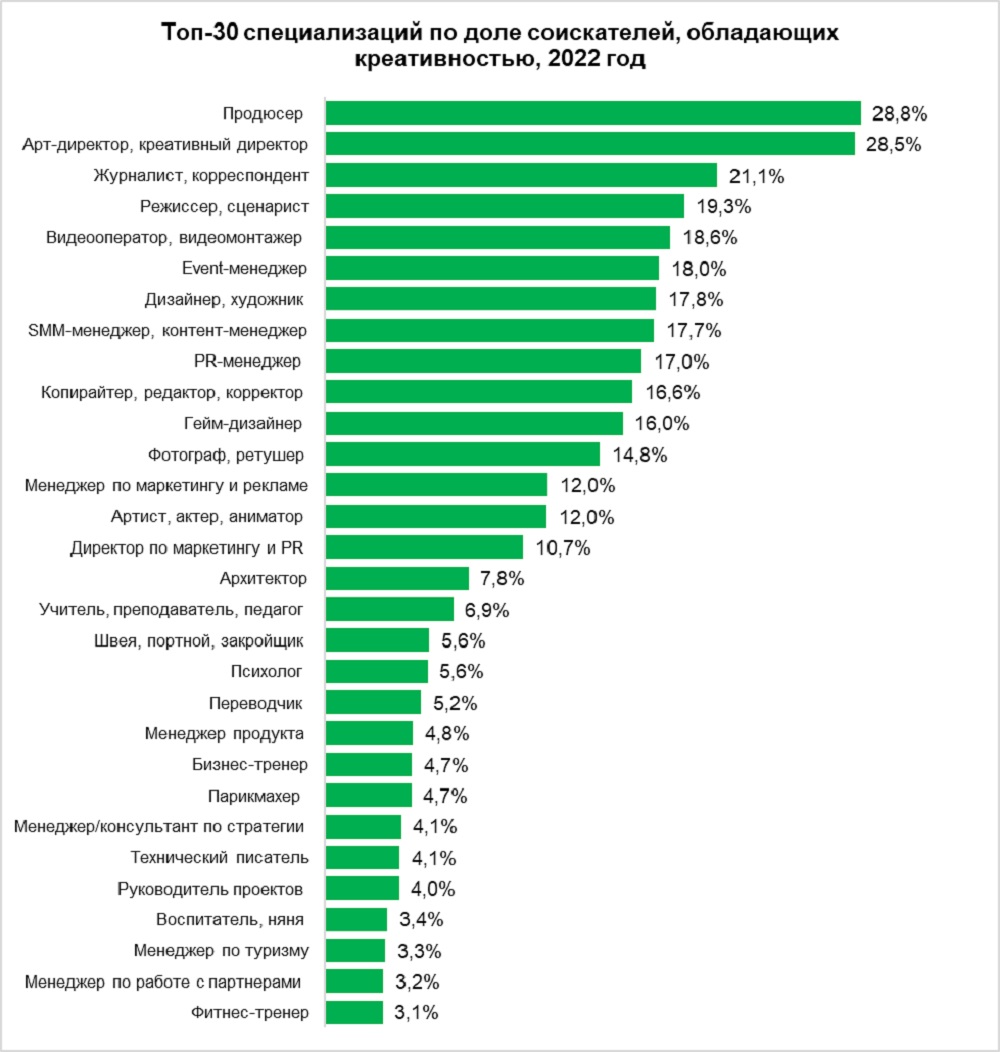 В целом, средний показатель по этому навыку, который указан в резюме соискателей, у свердловчан он чуть выше, чем по России. Здесь только 2,2% находящихся в поиске новой работы считают себя креативными. При этом, есть часть профессий, где креативность становится ключевым показателем – это продюсеры (в 28,8% резюме есть креативность), арт-директора (28,5%), журналисты (21,1%) и режиссеры (19,3%).
