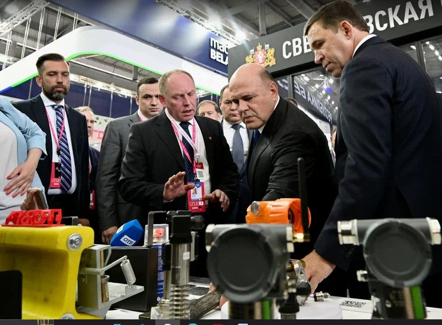 Председатель Правительства РФ Михаил Мишустин (второй справа) осмотрел стенды выставки ИННОПРОМ-2023, особое внимание уделив совместным разработкам Свердловской области с партнерами из дружественных стран Фото: