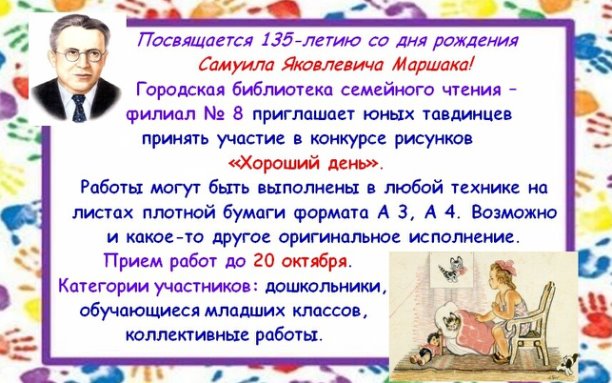 Городская библиотека семейного чтения – филиал № 8 Тавдинской ЦБС приглашает юных тавдинцев принять участие в конкурсе рисунков «Хороший день» .