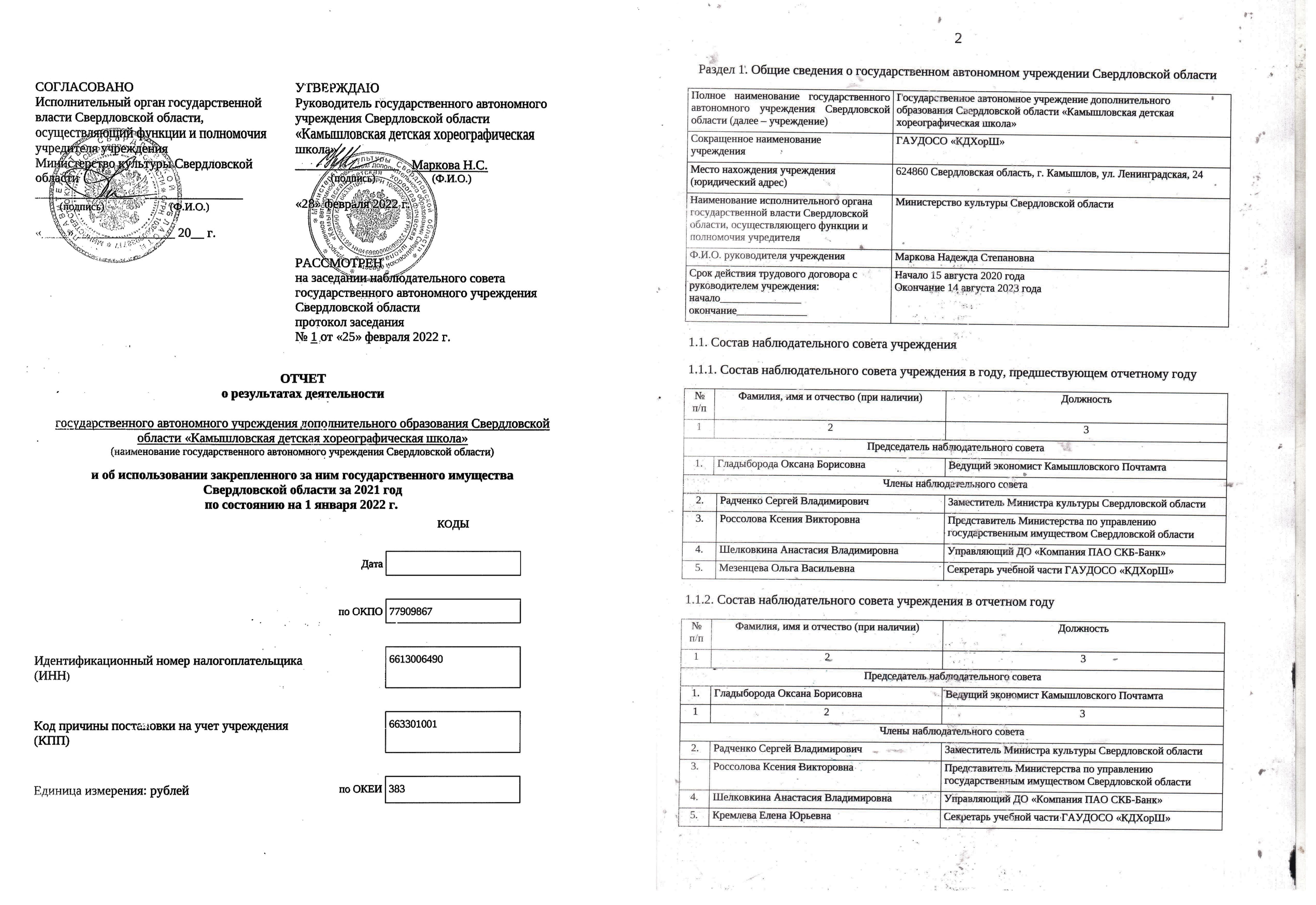 Публикация отчета о результатах деятельности 'Публикация отчета о результатах деятельности Государственного автономного учреждения дополнительного образования Свердловской области «Камышловская детская хореографическая школа» и об использовании закрепленного за ним государственного имущества Свердловской области за 2021 год по состоянию на 1 января года.