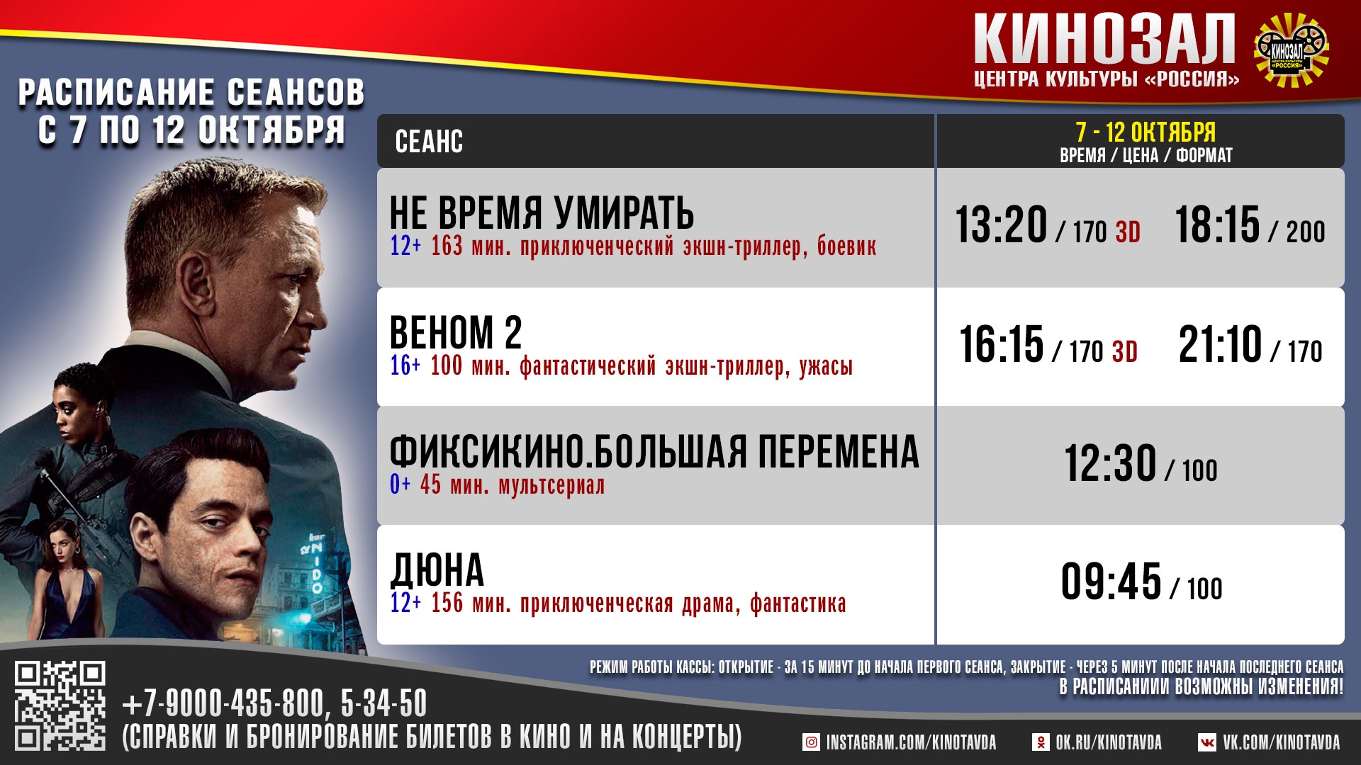 РАСПИСАНИЕ СЕАНСОВ КИНОЗАЛА ЦК "РОССИЯ" С 7 ПО 12 ОКТЯБРЯ