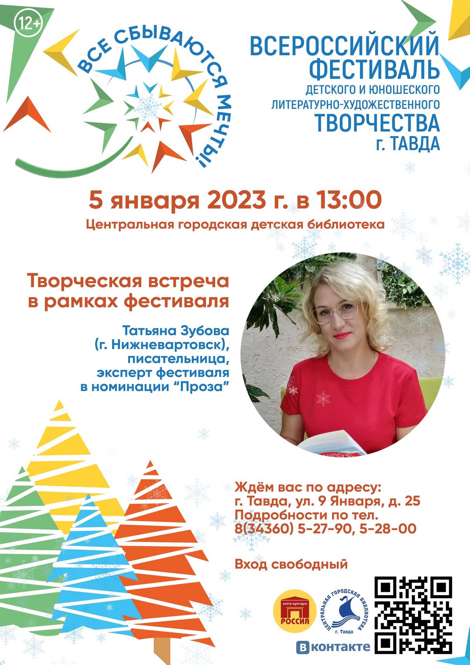 5 января в 13.00 в Центральной городской детской библиотеке (г. Тавда, ул. 9 Января, 25) пройдет встреча со сказочной писательницей Татьяной Зубовой из Нижневартовска.