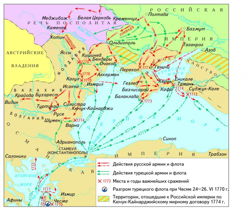 Война была начата турками внезапно. Крымский хан нанёс удар по южным границам России и начал продвижение вглубь страны. В это время крупные силы турецкой армии были сосредоточены на берегу Днестра, готовясь совершить поход на Киев. Кроме того, Турция привлекла к войне свой огромный флот, который действовал в Чёрном море. Мощь турецкой армии была огромной. Турок было численно больше, чем россиян. Большую роль сыграл и фактор внезапного нападения. Россия не была готова к войне, в результате в первые годы Русско-турецкая война 1768–1774 гг. проходила с перевесом Османской Империи. Однако, начиная с сентября 1769 года русская армия под командованием генерал-фельдмаршала П. А. Румянцева наносила туркам поражение за поражением.