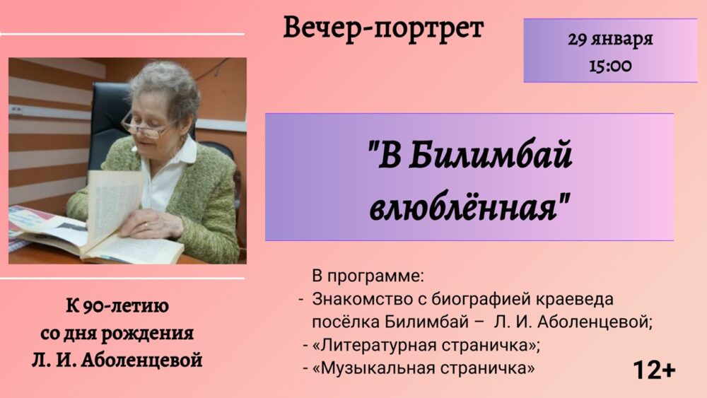 29 января 2025 года в 15:00, в выставочном зале Центральной библиотеки (ул. Ватутина 47) состоится вечер-портрет «В Билимбай влюблённая», приуроченный к 90-летию со дня рождения Людмилы Ивановны Аболенцевой – краеведа посёлка Билимбай.