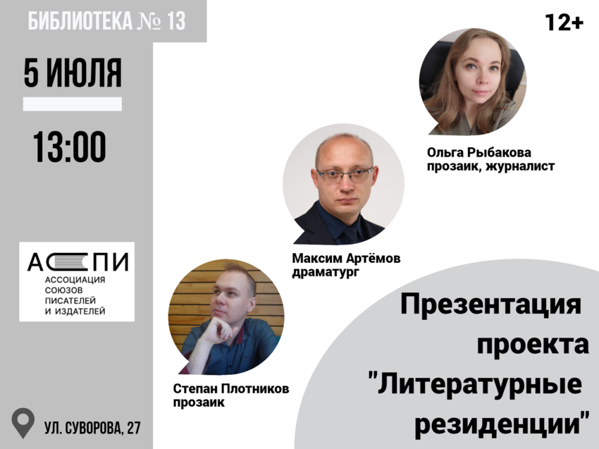 5 июля в библиотеке № 13 состоится встреча с молодыми писателями Ольгой Рыбаковой, Степаном Плотниковым и Максимом Артёмовым.