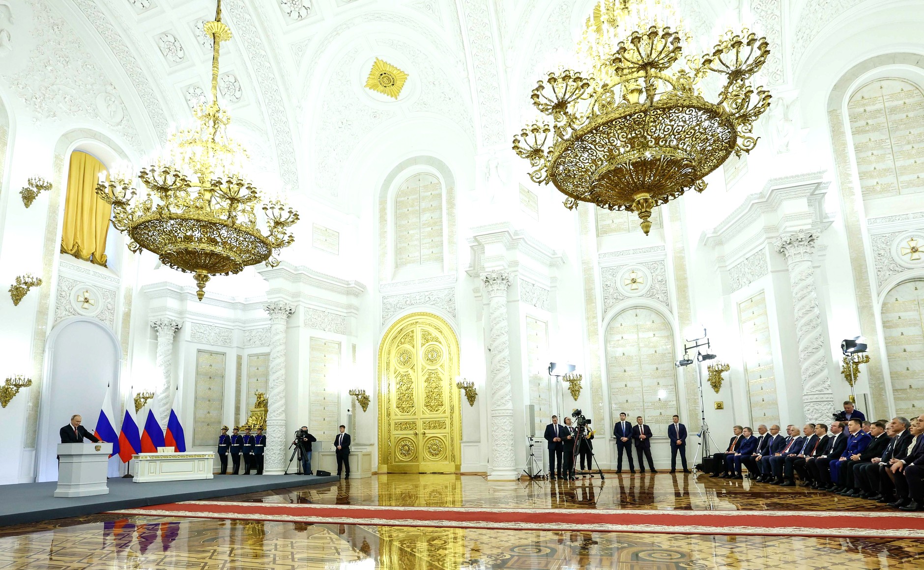 Президент России Владимир Путин принял участие в церемонии подписания договоров о принятии ДНР, ЛНР, Запорожской и Херсонской областей в состав России, сообщает kremlin.ru.