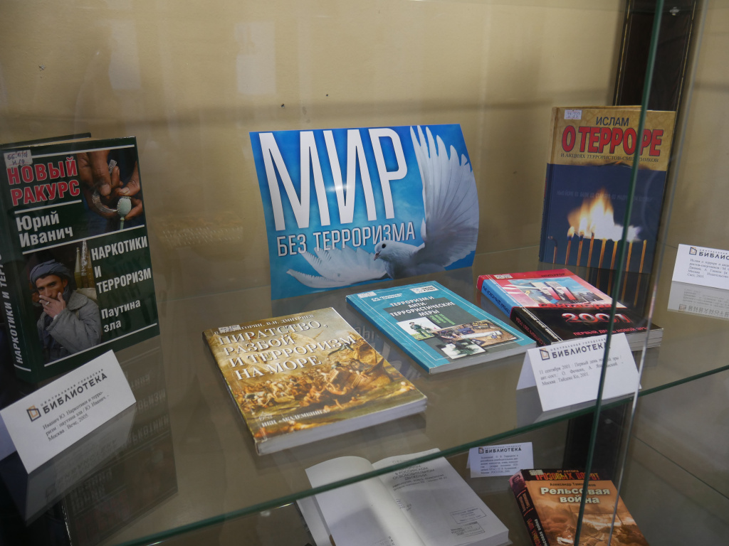 В экспозиции «Мир без терроризма» – научные работы, сборники публицистики, документы и научно-популярная литература. Например, сборник документов «Борьба с международным терроризмом», изданный Министерством образования и науки РФ; научно-практическое пособие «Защита гражданских объектов от терроризма»; сборник научных статей «Терроризм : правовые аспекты борьбы : нормативные и международные правовые акты с комментариям» и другие издания. Многие читатели интересуются научно-популярными произведениями, здесь для них: П. Крусанов «Действующая модель ада: очерки о терроризме и террористах», С. Горяинов «Деньги террора. Кто оплатил Беслан?», А. Брасс «Между Лениным и Арафатом» и другие книги на эту тему.