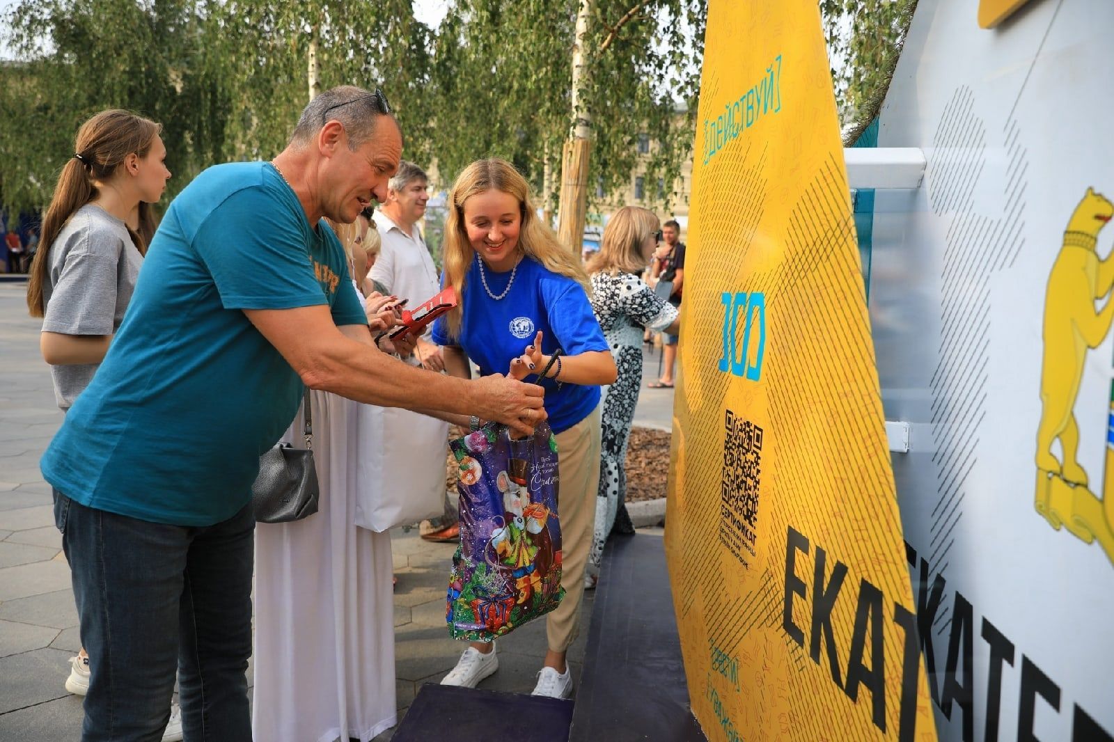 Все 11 дней – с 18 по 28 августа - для гостей V Фестиваля Русского географического общества работает Стенд «Екатеринбург. Большой Урал» и выставочное пространство. Это интерактивный макет в формате обелиска «Европа-Азия», включающий в себя постамент с металлической стелой, олицетворяющий символичные первые буквы пересекающихся континентов, сплетенные друг с другом в виде кристалла. У основания стенда расположился подиум, состоящий из четырёх граней, одна из которых символизирует элемент границы Европы и Азии, проходящей через всю Свердловскую область. Все гости Фестиваля могли совершить настоящее виртуальное путешествие и пересечь заветную границу между двумя частями света. Достаточно было навести камеру своего смартфона на специальный qr-код. А подтверждением этого необычного путешествия стал памятный сертификат, который, если показать его в туристко-информационном центре Екатеринбурга, дает право на получение памятного сувенира.