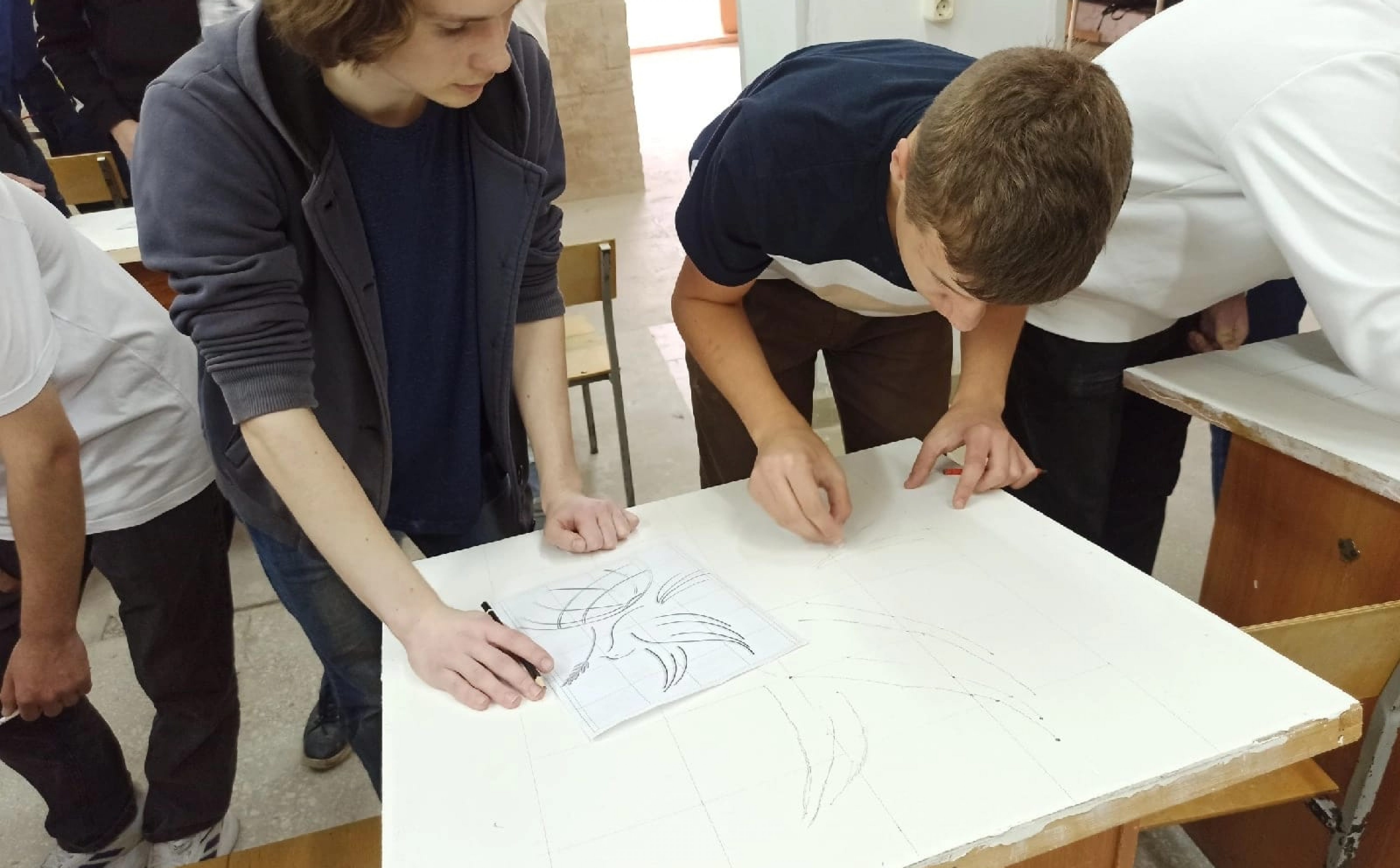 Работа была организована в звеньях по три человека, один из которых являлся наставником и двое – наставляемыми. Перед студентами стояла задача перенести эскиз рисунка на подготовленную поверхность в масштабе увеличения.