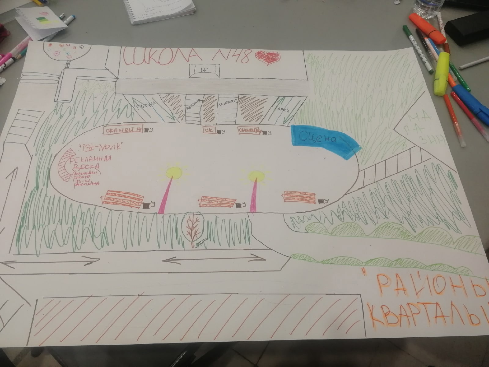 По озеленению пока ни с кем не общались. Но нам сказали, на кого можно выйти, надеемся, они не откажут. Ещё у нас большая проблема с освещением, во всём районе стоит один фонарь, который еле светит. Все нам говорят, что надо обязательно поработать с освещением. Соответственно, нужно связаться с НГЭС. Есть идея сделать подвесные гирлянды, чтобы было интересно и красиво.