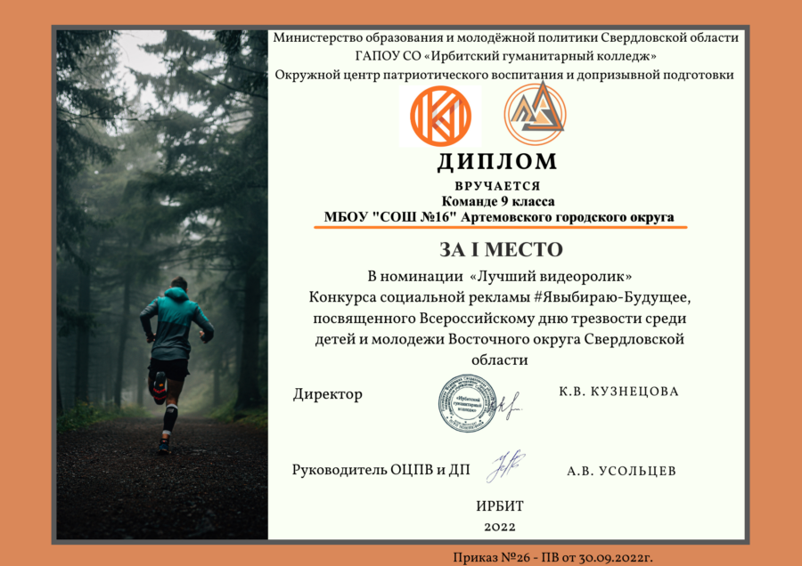 Команда 9 класса МБОУ «СОШ №16″ заняла 1 место в номинации «Лучший видеоролик», в конкурсе социальной рекламы #ЯВыбираю-Будущее, среди детей и молодежи Восточного управленческого округа Свердловской области».