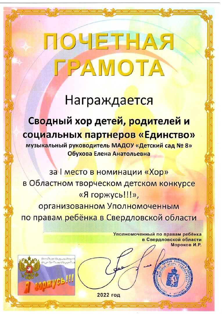 Сводный хор детей, родителей и сотрудников детского сада №8 занял первое место (номинация «хор») в конкурсе «Я горжусь!!!», организованном представительством Уполномоченного по правам ребенка в Свердловской области.