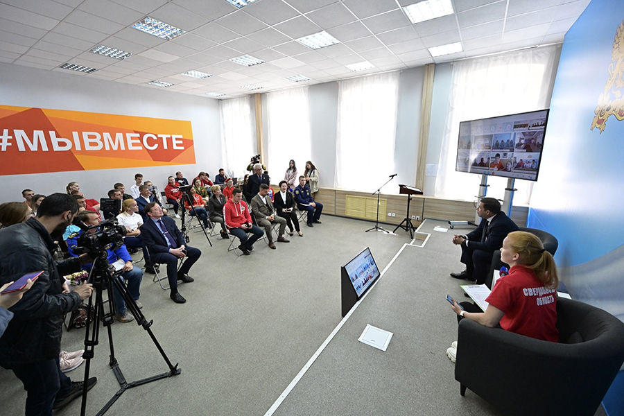 Встреча прошла в Доме добровольцев в Екатеринбурге на Крылова, 2 – в здании, переданном губернатором в распоряжение уральских волонтеров в прошлом году. К главной площадке подключились студии, расположенные в штабах движения #МыВМЕСТЕ в городах Свердловской области.