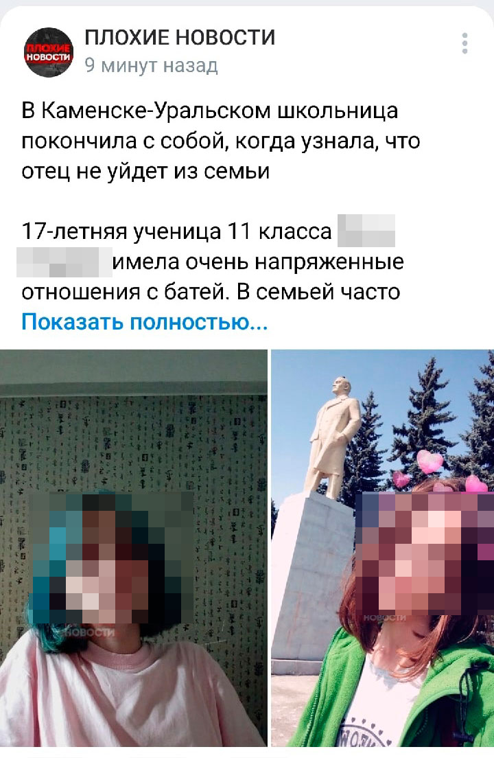 Отметим, что недавно паблик с похожим названием "Плохие новости" (1,5 млн. подписчиков) распространил фейковую новость о том, что в Каменске-Уральском якобы покончила с собой 17-летняя , на самом деле события произошли в Первоуральске . К тому же авторы опубликовали в соцсети персональные данные и лицо несовершеннолетней, что запрещено законом. Надеемся, прокуратура и Роскомнадзор отреагируют и примут меры к пабликам, периодически распространяющим фейковую информацию и нарушающие законы РФ.