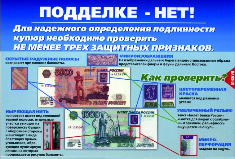 Основные отличительные признаки поддельных купюр: