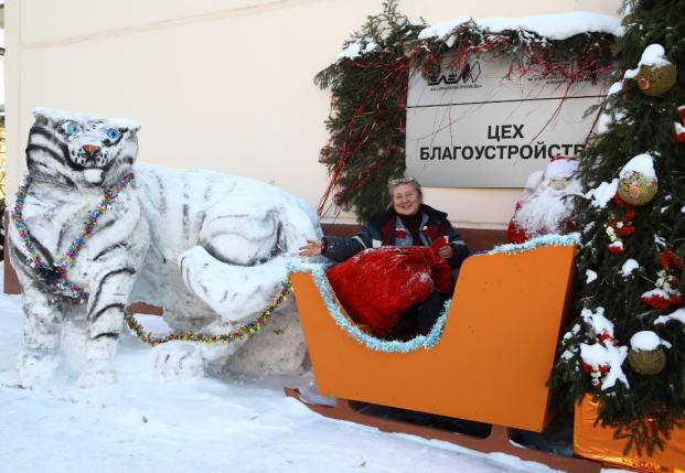 - Мы вылепили из снега 2-метрового символа года Тигра. Для его создания использовали 8 кубов снега. Тигр везет сани, в которых сидит Дед Мороз и машет прохожим рукой. «Оживить» его помог механизм для дворника от машины «Волга». Слоган «Под бой курантов верить стоит - все Новый год благоустроит» пришел мне на ум легко, в один из рабочих дней, - рассказала мастер цеха благоустройства Татьяна Нигаматова.