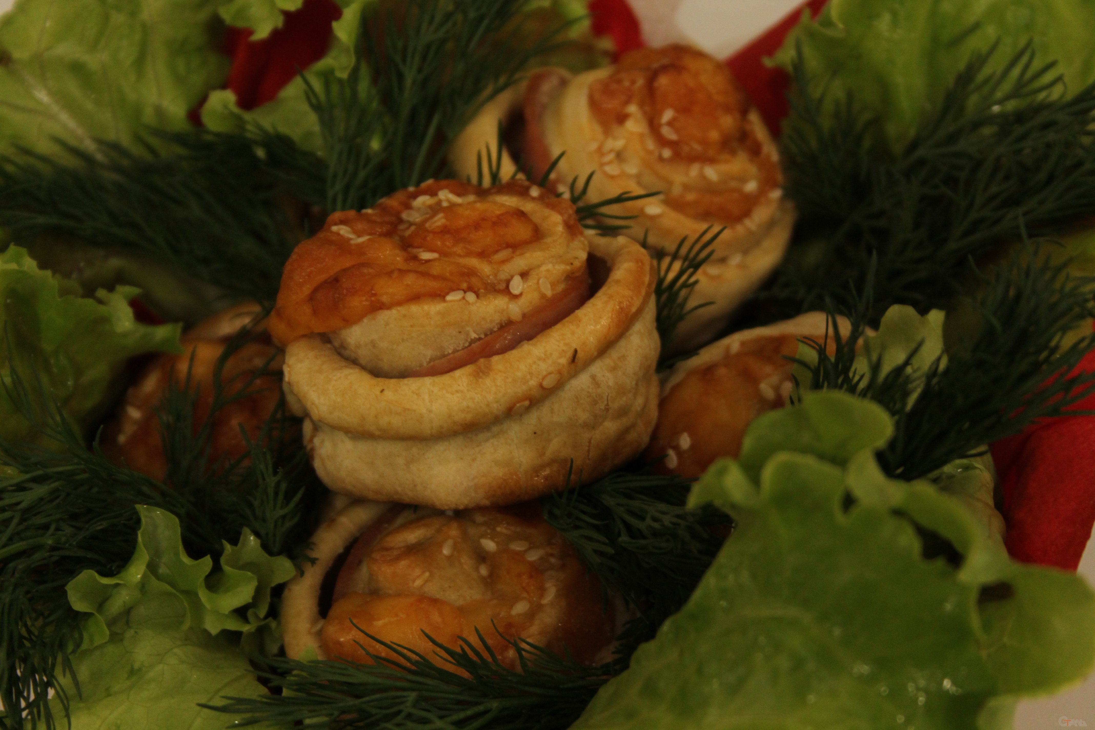 Способ приготовления. Тесто тонко раскатать, разрезать на полоски 4-5 см. Вдоль полосок разложить тонко нарезанную ветчину, затем сверху - сыр. Закрутить рулетиками, выложить на противень, застеленный пергаментом. Сверху обмазать яйцом и посыпать кунжутом. Выпекать при 160-180 градусах 20-25 минут до румяности.