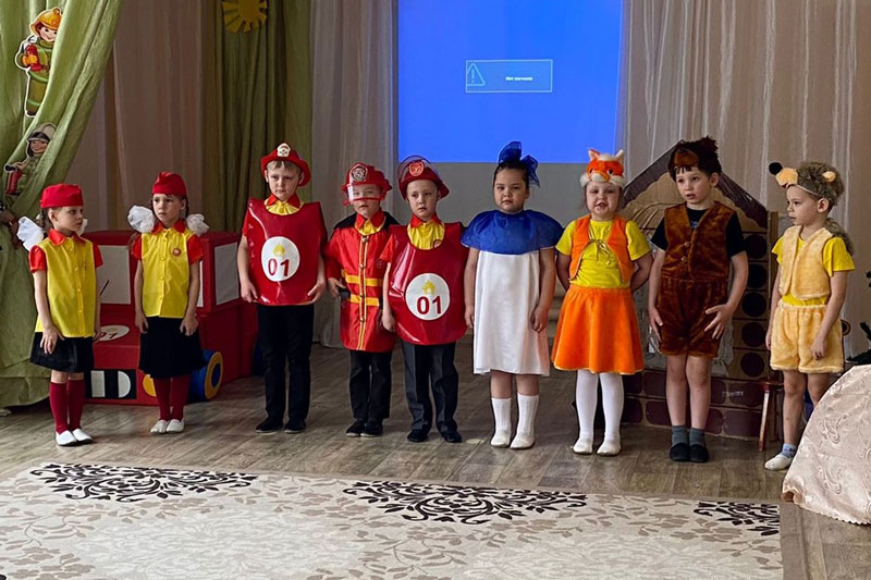 Воспитанники детского сада вместе с педагогическим составом организовали для гостей праздничный концерт, театральное представление на противопожарную тематику под названием «Доверчивый ежик», а также выставку рисунков и поделок противопожарной направленности.