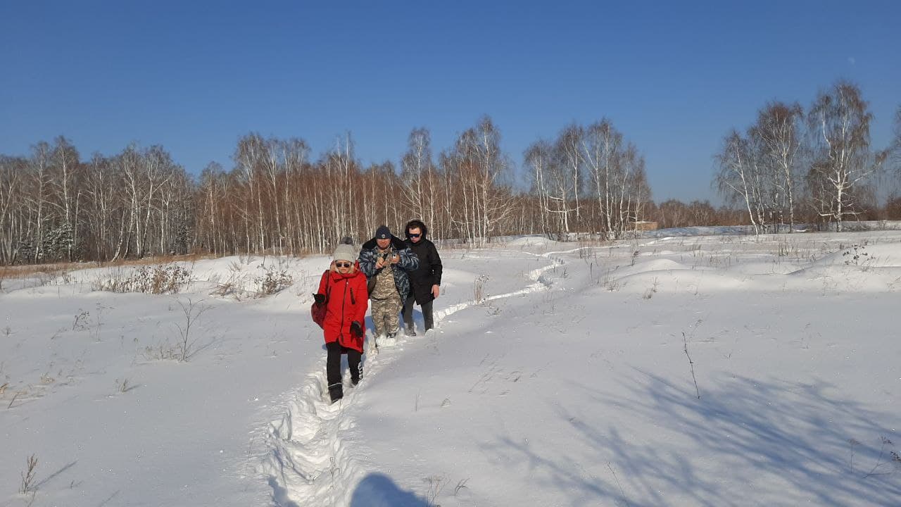 В райцентре – селе Долгодеревенское — нас встречает местный житель Сергей. Он соглашается быть нашим проводником. Едем на окраину села – коттеджный поселок Молзавод (в народе – Простоквашино). Аккуратные домики за коваными заборами, лают собаки, пахнет печным дымом, тихая размеренная жизнь. Сразу за поселком начинается березовый лес, на машине здесь не проехать. Дальше – только пешком, по колено в снегу. Сергей выводит нас к болоту. Оно не замерзает даже зимой, говорят, сюда часто прилетают кормиться утки. Огромное пятно темной жижи с зарослями сухого камыша.