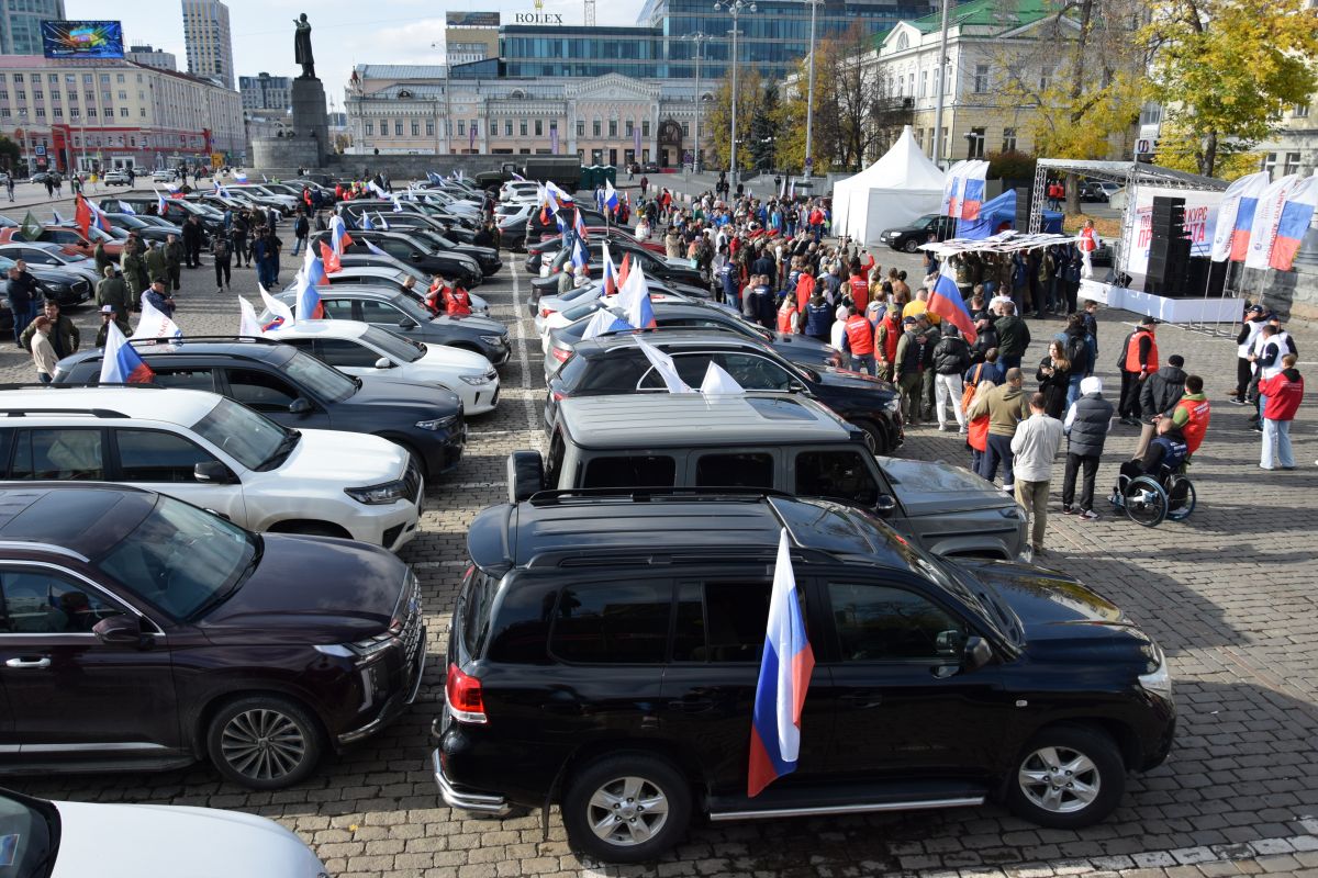 Порядка 150 машин с флагами стартовали с главной площади города и проехали по проспекту Ленина. Возглавил колонну уральский автогонщик Сергей Карякин.