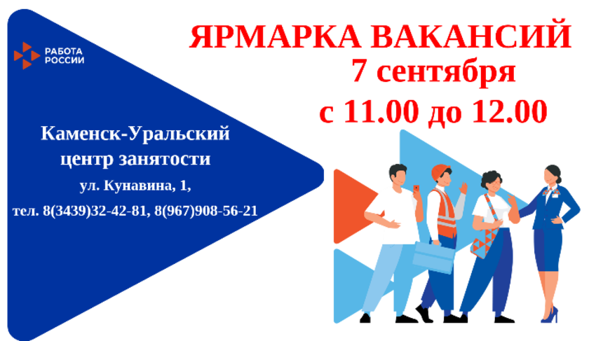 7 сентября с 11.00 до 12.00 в Каменск-Уральском центре занятости по адресу: улица Кунавина, 1 состоится ярмарка вакансий.
