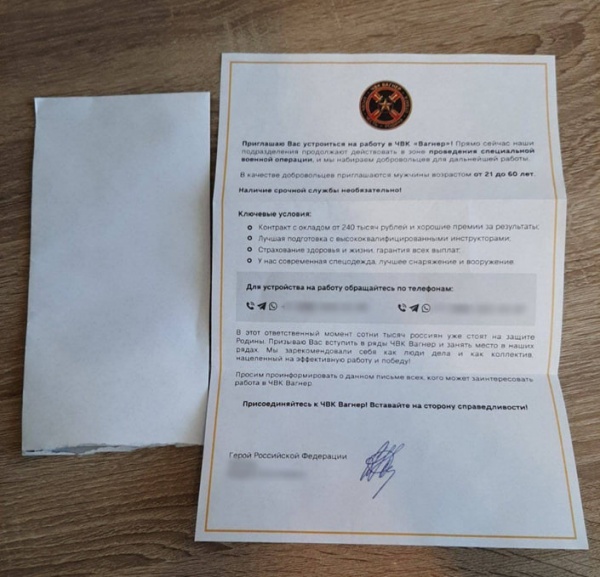 «Приглашаю Вас устроиться на работу в ЧВК «Вагнер»! Прямо сейчас наши подразделения продолжают действовать в зоне проведения специальной военной операции и мы набираем добровольцев для дальнейшей работы».