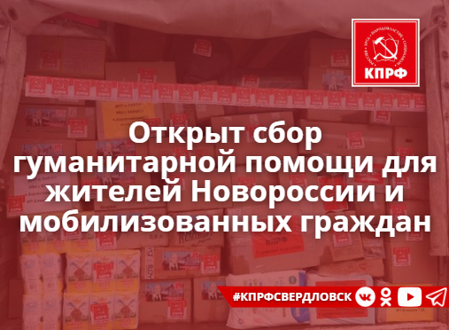 Свердловское областное отделение КПРФ объявляет сбор гуманитарной помощи для жителей, пострадавших на территориях ЛДНР, Запорожской и Херсонской областей, а также для мобилизованных граждан, военнослужащих ВС РФ контрактной формы и добровольцев из Свердловской области.
