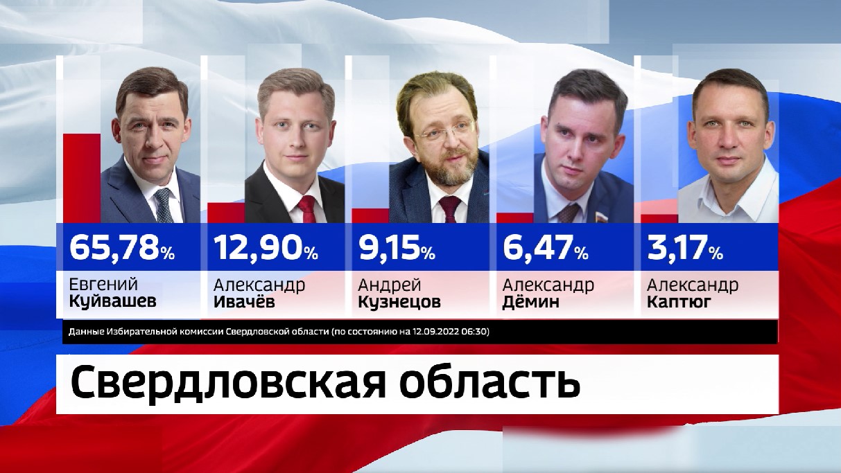 Лидером этой предвыборной гонки стал Евгений Куйвашев, набрав почти 66 % голосов избирателей. Следом с заметным отрывом идёт Александр Ивачёв, у него около 13 %. На третьем месте Андрей Кузнецов с 9 %. За ним Александр Дёмин, у которого 6 %. Список замыкает Александр Каптюг, набравший 3 %.